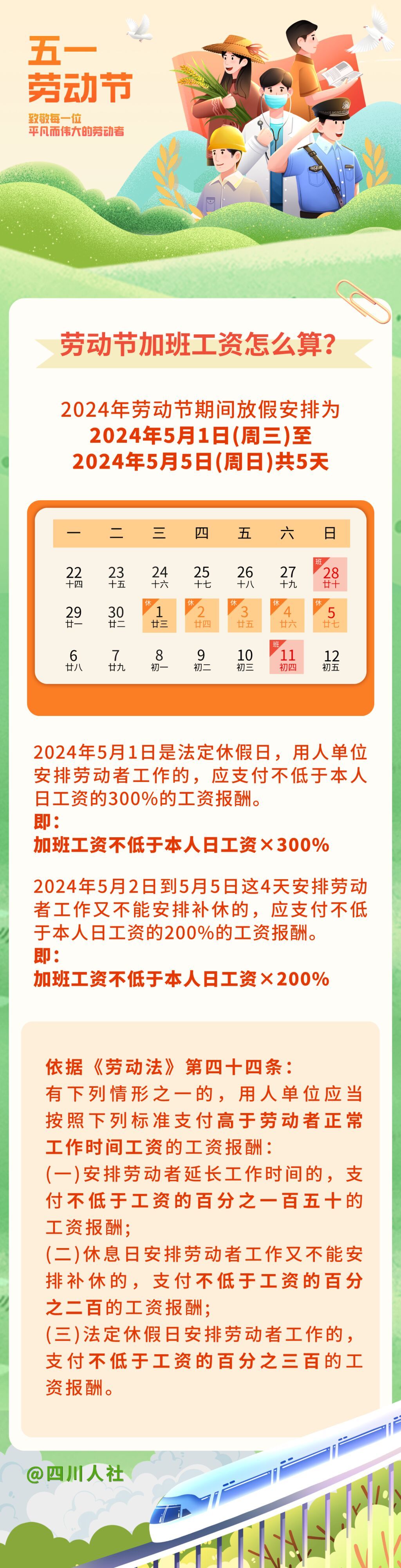 每逢假日,总会有人因为工作需要加班。加班工资怎么算呢?5月1日,四川省人力资源和社会保障厅就帮大家算了一下今年“五一”劳动节期间的加班工资,其中5月1日是三倍日工资,5月2日至5日这4天,算双倍日工资哟。具体来看一下吧——