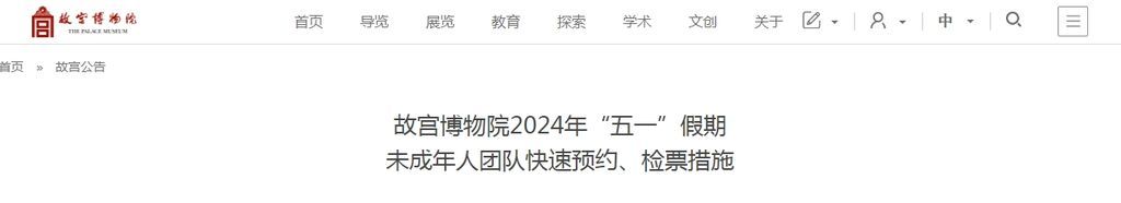 故宫博物院近日发布2024年“五一”假期未成年人团队快速预约、检票措施。根据这一措施,由独立法人机构组织的、未成年人占比85%以上的团队,可提前1日至6日通过邮箱yycg@dpm.org.cn进行团队未成年人门票快速预约,团队中的成年人门票需另行预约购买。这一措施于2024年5月1日至5月5日实施。