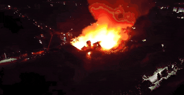 根据最新图片显示,大礼堂房顶基本坍塌,被火烧过的外墙一片焦黑,只剩下绿色安全隔离网。