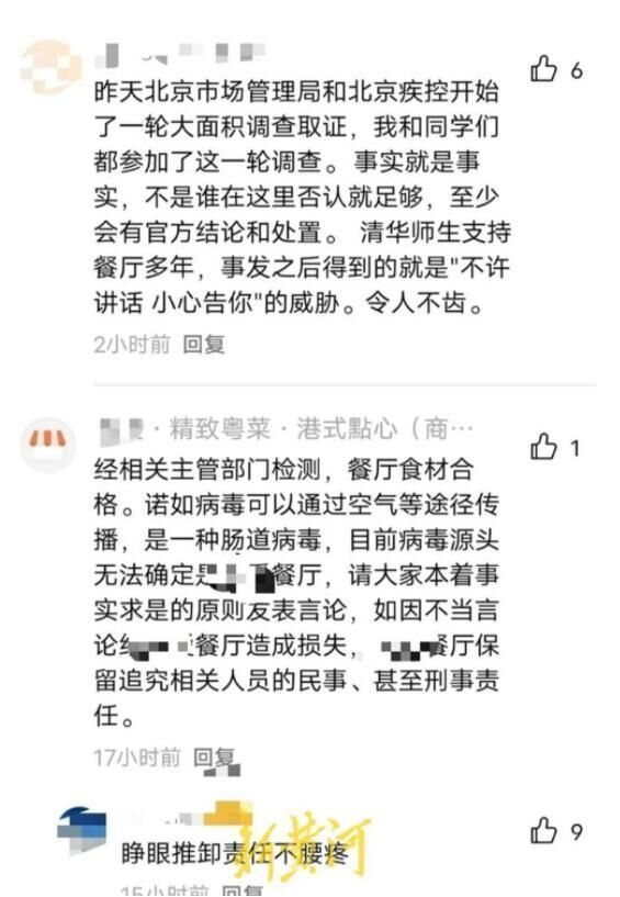 新黄河记者注意到,大众点评平台上显示,涉事餐厅已暂停营业。餐厅评论区也有多个涉及此事的留言,有用户留言:“昨天北京市场(监督)管理局和北京疾控开始了一轮大面积调查取证,我和同学们都参加了这一轮调查。”餐厅也给予了回复:“经相关主管部门检测,餐厅食材合格。诺如病毒可以通过空气等途径传播,是一种肠道病毒,目前病毒源头无法确定是餐厅。”不过随后该回复疑似被删除,已无法查看。针对回复,有用户则称:“细菌感染,不是诺如病毒,不用找诺如病毒当替罪羊了。”在一张用户贴出的门诊病历上可以看到,疑似就餐者被诊断为急性胃肠炎。