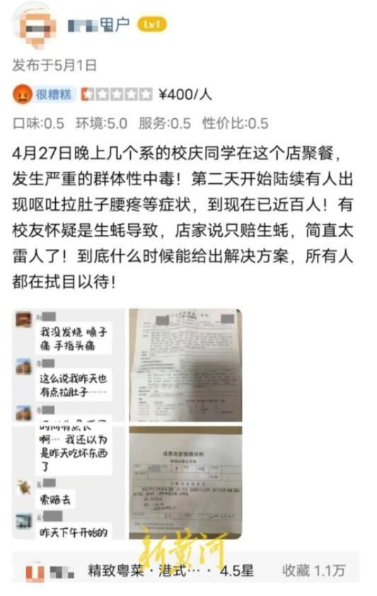 5月4日,有清华大学的校友告诉新黄河记者,已经向北京市场监督管理部门举报,疾控中心也已经介入此事。他还提到,“餐厅不仅没有道歉,而且敷衍了事不作为,完全没有对食品安全、客户的身体健康有着基本的尊重,缺失职业操守,很难想象这样一家餐厅能够在北京五道口经营这么多年。”关于解决方式,建议书中提到,在(海淀)区市场监督管理局的现场调解下,多次与餐厅进行沟通。餐厅目前仅退还了部分人员餐费;但在赔偿受害者的医药费、误工费等其他款项,以及彻查原因等方面,未能达成一致。