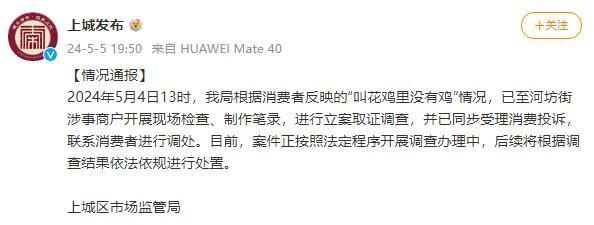 2024年5月4日13时,我局根据消费者反映的“叫花鸡里没有鸡”情况,已至河坊街涉事商户开展现场检查、制作笔录,进行立案取证调查,并已同步受理消费投诉,联系消费者进行调处。目前,案件正按照法定程序开展调查办理中,后续将根据调查结果依法依规进行处置。