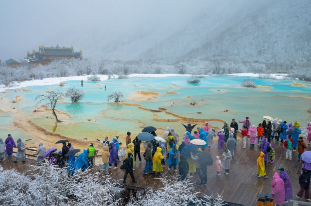 “五一”假期,黄龙景区以纷纷扬扬的大雪喜迎八方宾客,为营造浓厚的节日氛围,景区开展了琵琶弹唱等松潘地区特色非遗表演活动,其中,黄龙主景区共接待游客51405人次,同比增长12.03%。