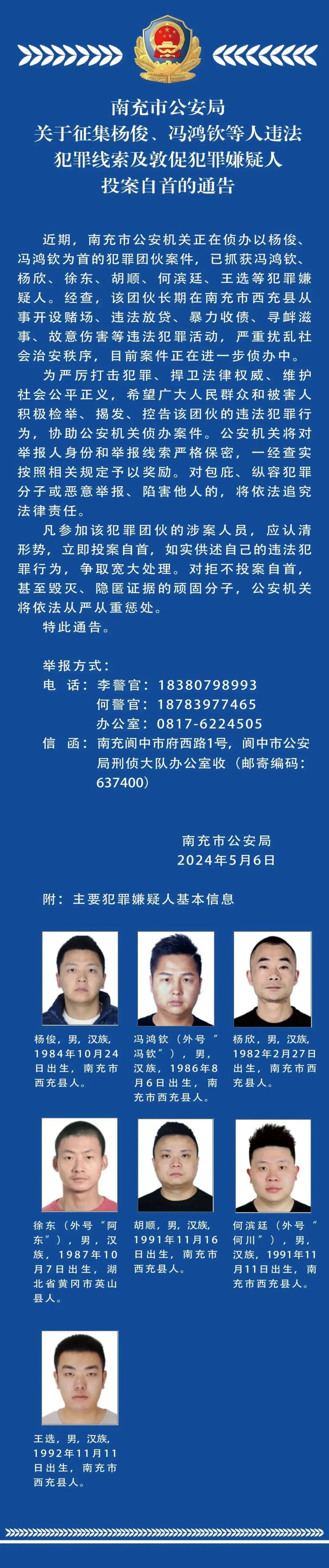 四川南充公安:公开征集杨俊、冯鸿钦等人犯罪线索