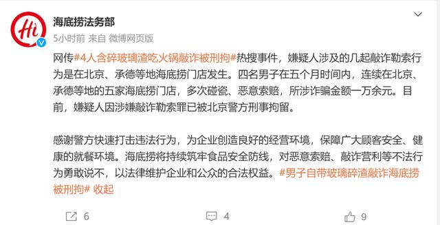 ·海底捞回应“4人含玻璃渣吃火锅敲诈”:多次碰瓷、恶意索赔,所涉诈骗金额一万余元。