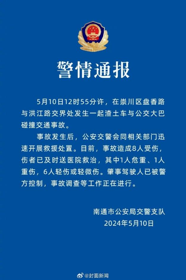 ·江苏南通一大巴车与渣土车发生碰撞,警方通报:事故造成8人受伤,伤者已送医救治。