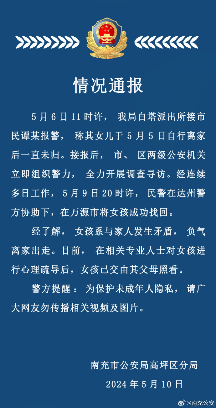 ·南充16岁失联高中女生已找到,官方通报:系负气离家出走。