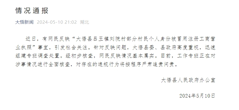 ·湖北大悟百余村民反映身份被冒用注册个体工商户,湖北大悟县通报。