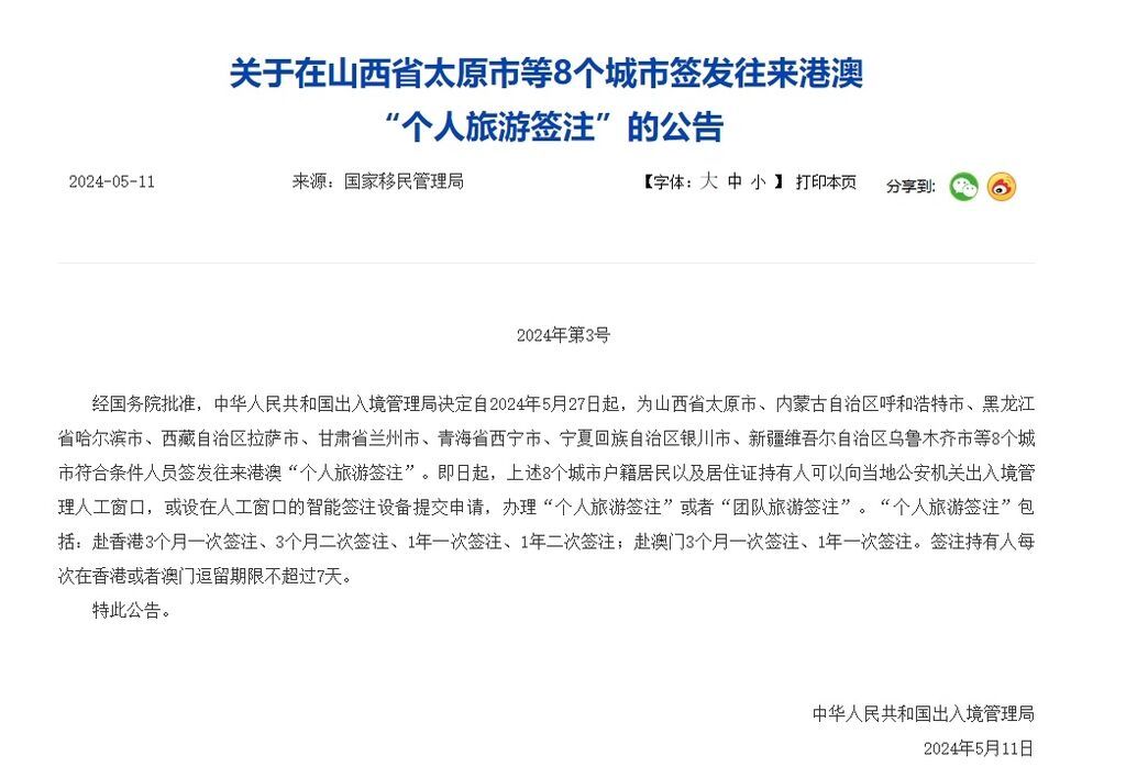 据国家移民管理局消息,经国务院批准,中华人民共和国出入境管理局决定自2024年5月27日起,为山西省太原市、内蒙古自治区呼和浩特市、黑龙江省哈尔滨市、西藏自治区拉萨市、甘肃省兰州市、青海省西宁市、宁夏回族自治区银川市、新疆维吾尔自治区乌鲁木齐市等8个城市符合条件人员签发往来港澳“个人旅游签注”。