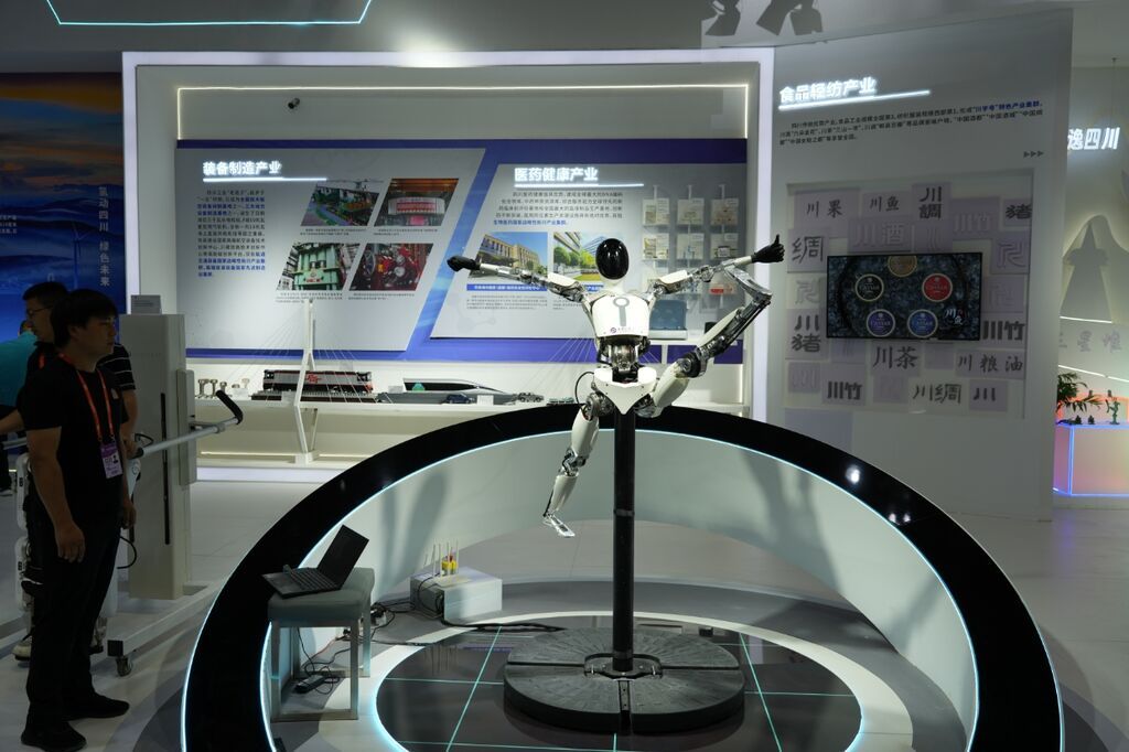 走进展厅,首先看到的就是正做出一字马、跳跃、耸肩等动作的人形机器人,其灵活性堪比舞蹈演员。该机器人由四川福德机器人股份有限公司研制,福德机器人业务总监颜进介绍,“裸机仅重37公斤,负重深蹲突破145公斤,是目前行业已知最高水平。”