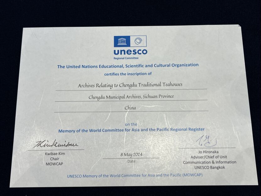 5月8日,在联合国教科文组织世界记忆亚太地区委员会第十次会议上,由我国国家档案局申报的“成都老茶馆相关档案”“德格印经院院藏雕版”“徽州千年宗姓档案”三项档案文献,成功入选《世界记忆亚太地区名录》。这也是四川首次有文献档案入选这一名录。