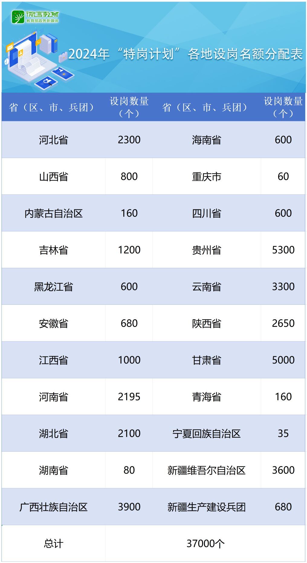 教育部、财政部近日联合印发《关于做好2024年农村义务教育阶段学校教师特设岗位计划实施工作的通知》(以下简称《通知》),全国计划招聘特岗教师3.7万名。