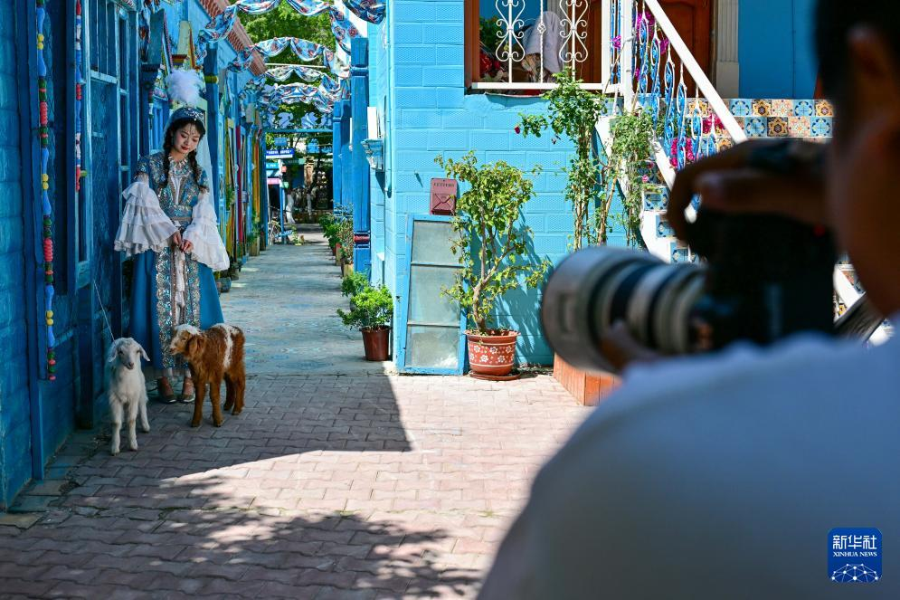 在伊犁哈萨克自治州伊宁市六星街,游客体验旅拍项目。