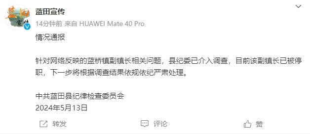 ·官方通报“副镇长半夜叫别人妻子唱歌”:涉事副镇长已被停职。