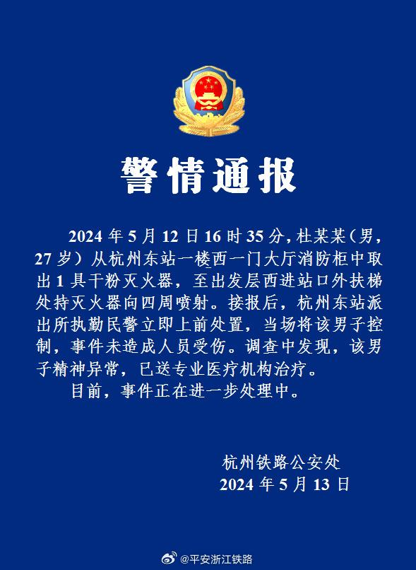 ·警方通报男子杭州东站喷射灭火器:男子精神异常,已送专业医疗机构治疗。