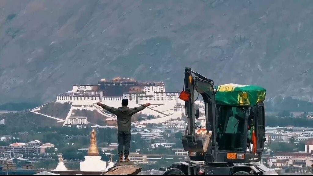 抵达拉萨短暂休息后,许飞开着自己的轮式挖掘机,到网红S湾打卡,还用无人机拍摄了与布达拉宫合影的视频。