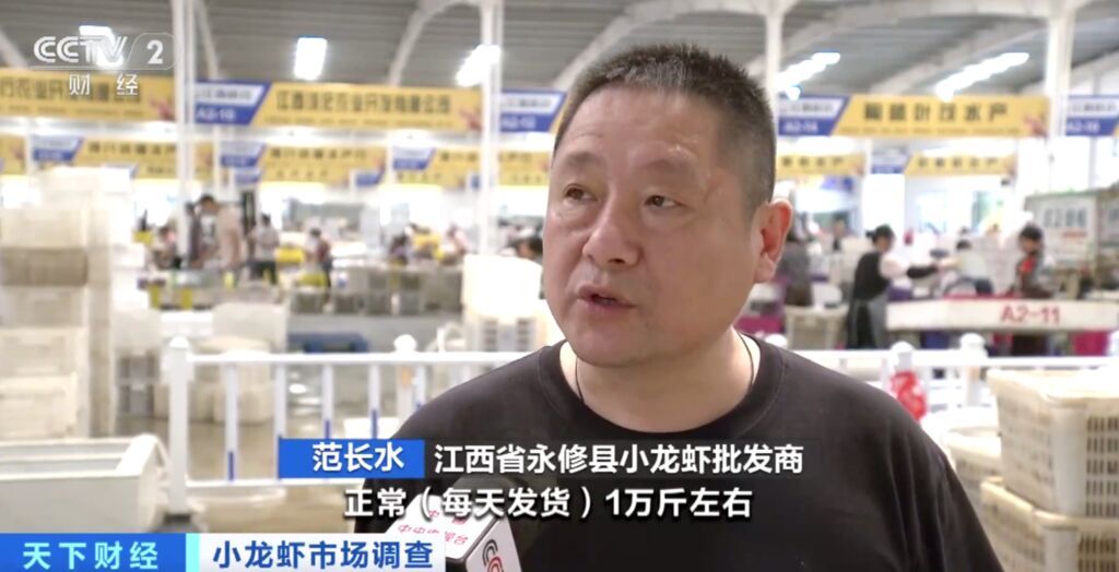 江西省永修县小龙虾批发商 范长水:正常每天发货10000斤左右,现在马上进入高峰期,每天上货大概40000斤到50000斤,有些剩余没走完的货,旁边有几个大冷库可以冷藏。