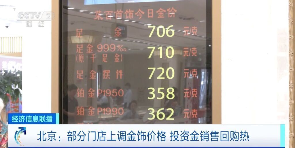 在北京的一家金店,受国际金价上涨影响,店内足金饰品的价格已调至每克706元,足金999的价格则上调至710元。而随着金价一路上涨,也有部分消费者并未着急出手,仍在观望。