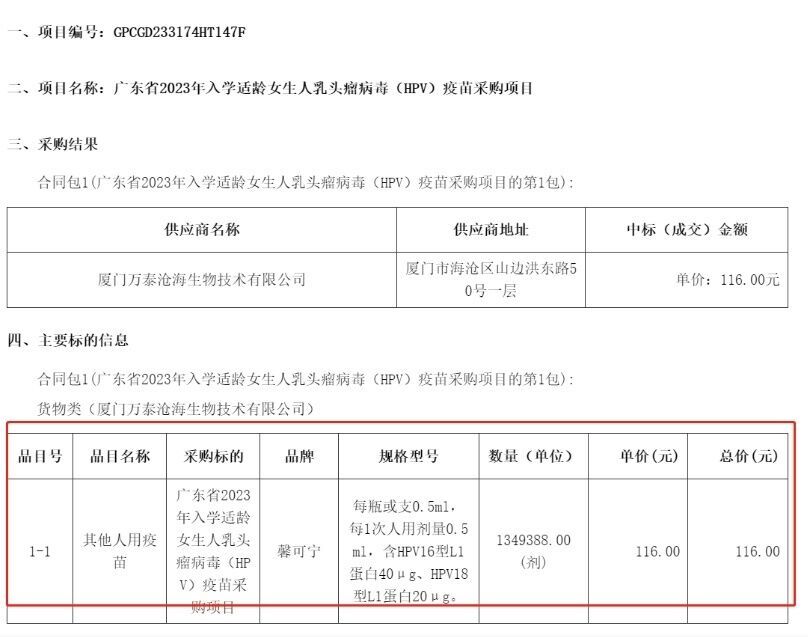 万泰生物也以降价接招。2023年7月,广东省政府采购中心官网公布的广东省宫颈癌疫苗采购项目结果公告显示,万泰生物则以116元/支的价格中标,相较于上市初期的329元降幅达到64%。
