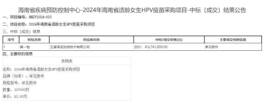 据海南省疾病预防控制中心4月底公布的信息,沃森生物旗下的玉溪泽润生物技术有限公司的二价宫颈癌疫苗在2024年海南省适龄女生HPV疫苗采购项目中标,价格为每支63元,采购数量10.7万剂。