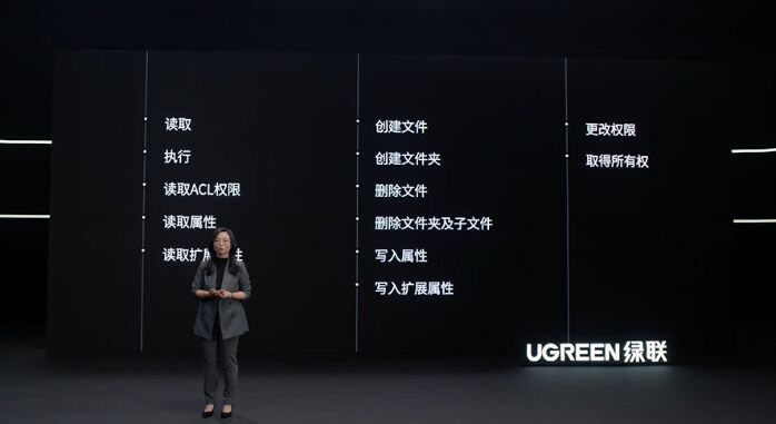 在另一大底层的“文件管理”功能上,UGOSPro系统采用了“个人文件夹”和“共享文件夹”两大文件类型,配合丰富的权限设置来支撑用户精细的数据管理需求。其中“个人文件夹”里的内容,其他普通用户无法访问;而“共享文件夹”中的数据,则可以通过权限设置来实现多用户或者用户组的访问控制。在未来,包括“读取属性”“创建文件”“删除文件”在内的13种权限设置将陆续上线。