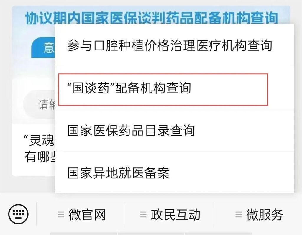 为了进一步便利参保患者使用“国谈药”,国家医保局微信公众号已开通“国谈药”配备机构查询功能,具体查询步骤如下: