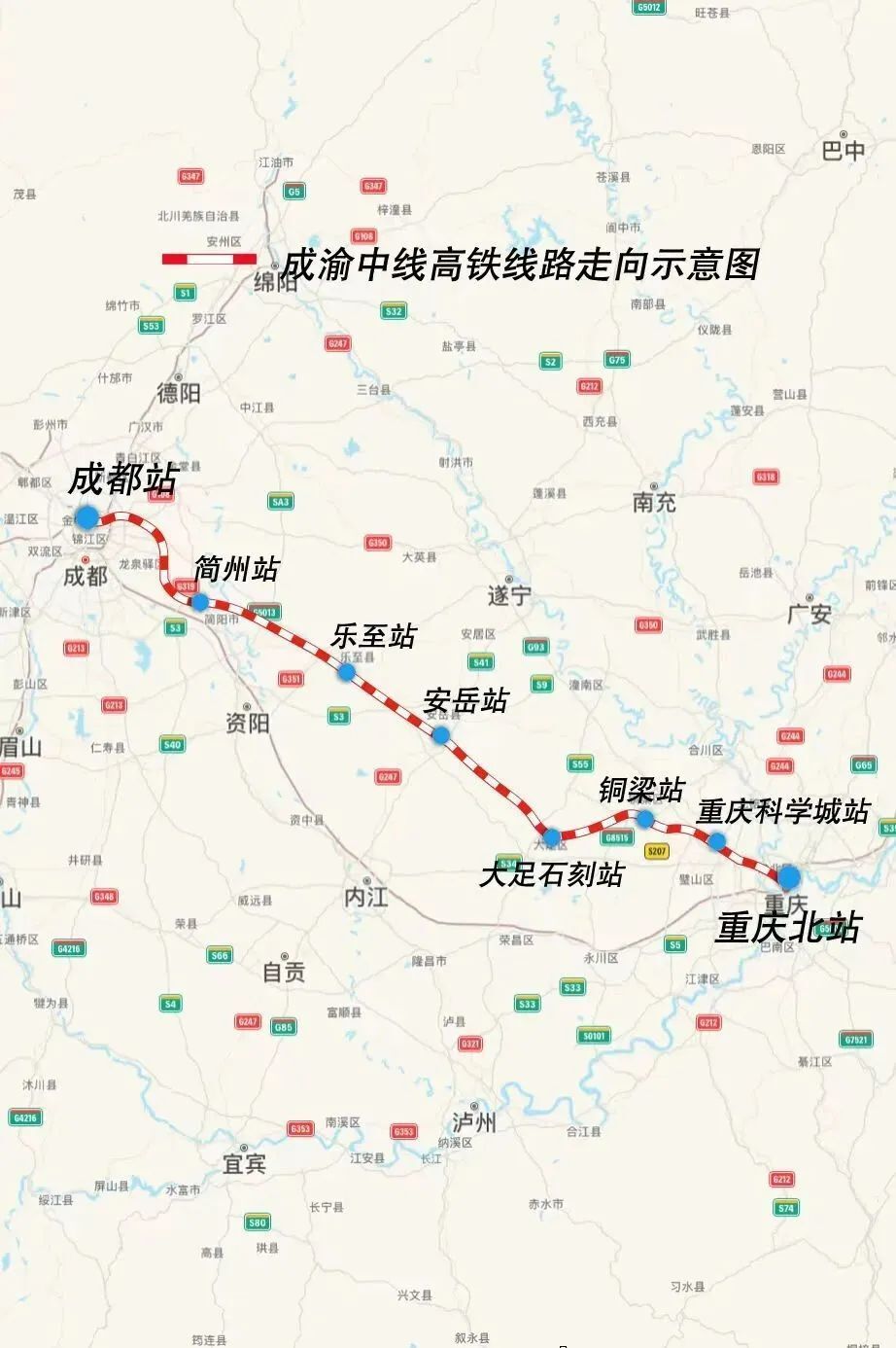 作为国家“八纵八横”高铁网沪渝蓉沿江高铁大通道的重要组成部分,成渝中线高铁自重庆枢纽重庆北站起,向西经重庆市渝北区、沙坪坝区、璧山区、铜梁区、大足区,四川省资阳市、成都市,引入成都枢纽成都站,正线全长292公里,设计时速350公里。
