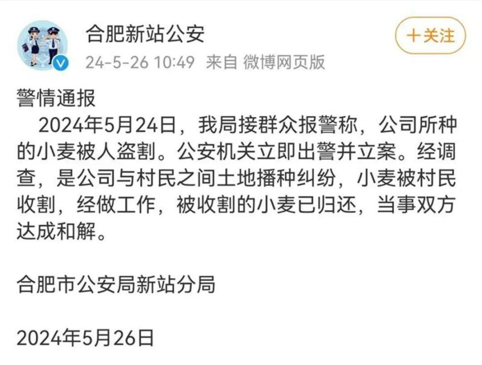 ·合肥网民反映小麦被人盗割,警方通报:系土地播种纠纷。