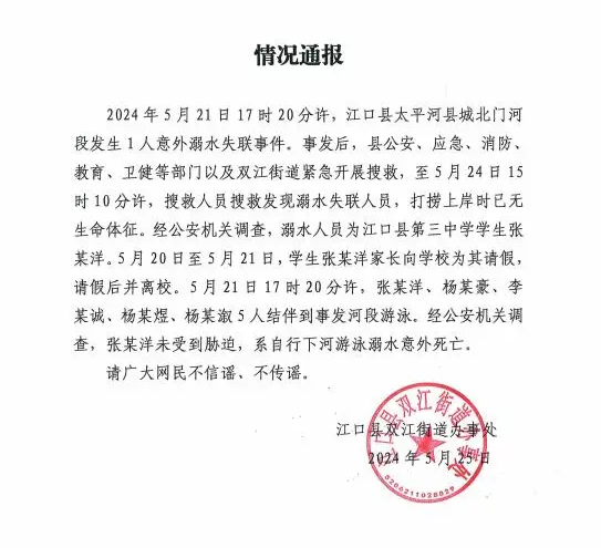 ·贵州江口通报一中学生溺亡:未受到胁迫,系自行下河游泳溺亡。