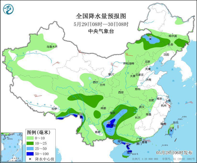 5月28日8时至29日8时,广西南部和西部、广东西南部、海南岛、贵州西南部、云南东部和西北部、四川盆地西部、重庆西部、甘肃南部、宁夏中部、黑龙江北部、西藏东南部以及台湾岛西部等地的部分地区有大到暴雨,其中,广东西南部、海南岛北部、四川盆地西北部、西藏东南部等地局地有大暴雨(100~120毫米)。新疆沿天山地区及南疆盆地、内蒙古中西部、甘肃西部、浙江等地的部分地区有4~6级风,其中,浙江东部沿海地区等地的部分地区风力可达7级以上;东海大部、台湾海峡、台湾以东洋面、南海东北部海域有6~7级、阵风8级的偏东到东北风。