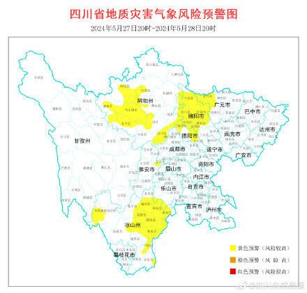 根据四川省气象台天气预报情况,结合四川省地质环境条件,5月27日20时至5月28日20时,全省地质灾害气象风险预警结果如下: