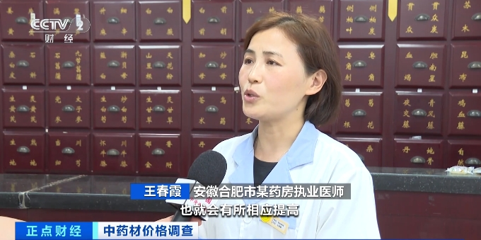 安徽合肥市某药房执业医师 王春霞:因为采购成本上涨,所以零售价格也就会有所相应提高。比如一克涨0.1元,一副药是抓15克,15克就要1.5元,如果是十天,就要多十几元,顾客就会觉得贵了。