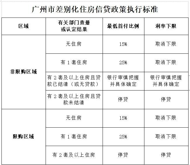 记者从人民银行广东省分行获悉,同日,广东市场利率定价自律机制根据广州房地产市场形势变化及市政府调控要求,对广州市差别化住房信贷政策作出以下调整: