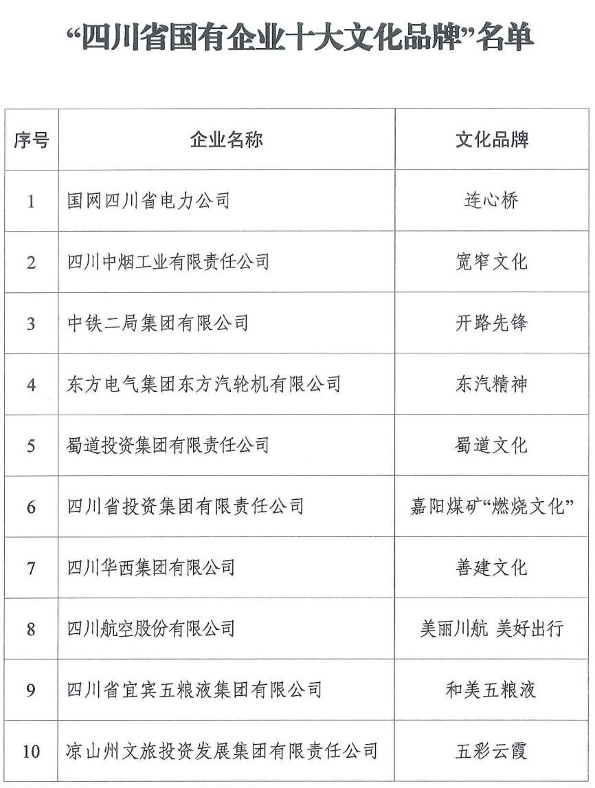 此次“四川省国有企业十大文化品牌”评选,是四川国有企业文化品牌的“集体亮相”。省国资委相关负责人介绍,长期以来,省国资国企系统高度重视企业文化建设,在企业文化培育上做了大量卓有成效的工作,先后涌现出一批享誉全省甚至全国的知名文化品牌。