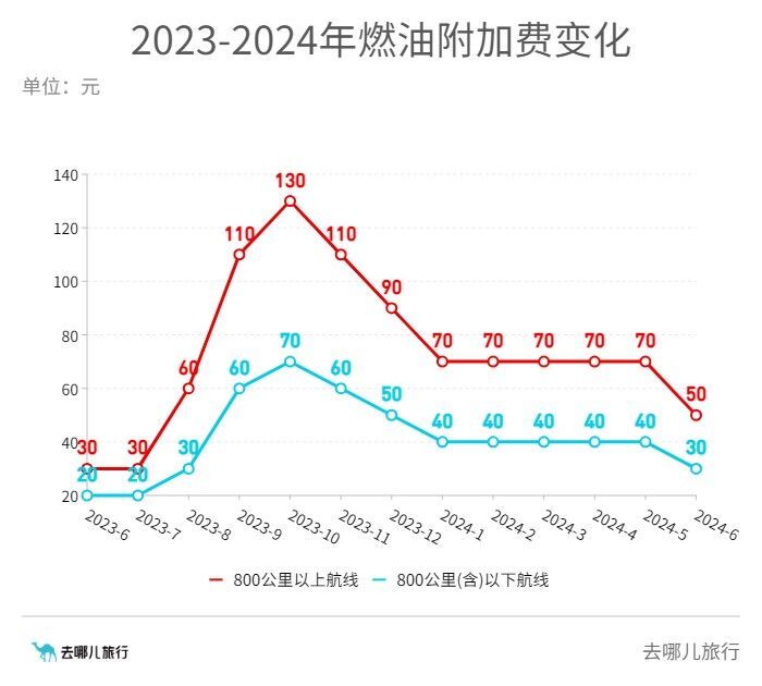 5月29日,澎湃新闻记者获悉,在线旅游平台“去哪儿”接到河北航空消息,自2024年6月5日(出票日期)起,成人旅客:800公里以上航线每位旅客收取50元燃油附加费,800公里(含)以下航线每位旅客收取30元燃油附加费。相较于调整前分别降低了20元和10元。