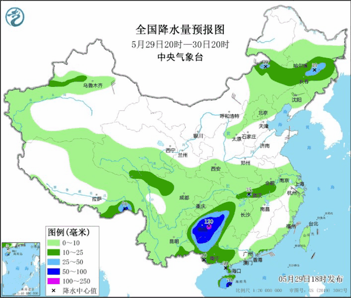 中央气象台预计:未来10天(5月29日至6月7日),华南及云南东部、贵州、四川西部和南部多降雨天气,大部地区有中到大雨,部分地区有暴雨;降水主要时段为5月29日至6月1日、6月3~4日;6月3~7日,云南、贵州、四川西部、江南西部至华南等地多中到大雨或阵雨天气。