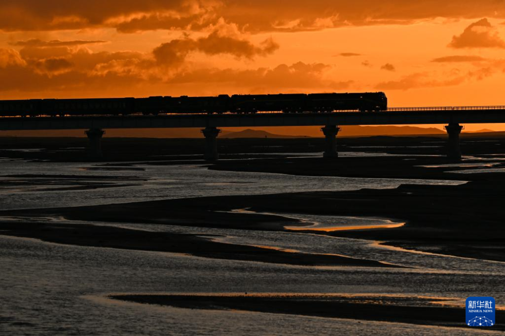 初夏时节,青藏铁路与高山、河流相映成趣,壮美绚丽。