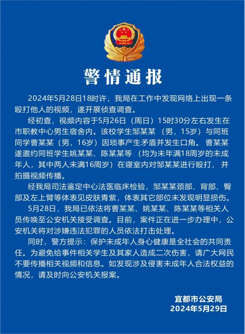 ·湖北宜都警方通报男生遭多名同学殴打并被拍视频。