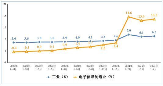 1—4月份,规模以上电子信息制造业增加值同比增长13.6%,增速分别比同期工业、高技术制造业高7.3个和5.2个百分点。4月份,规模以上电子信息制造业增加值同比增长15.6%。