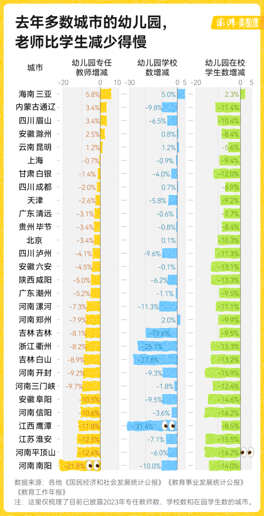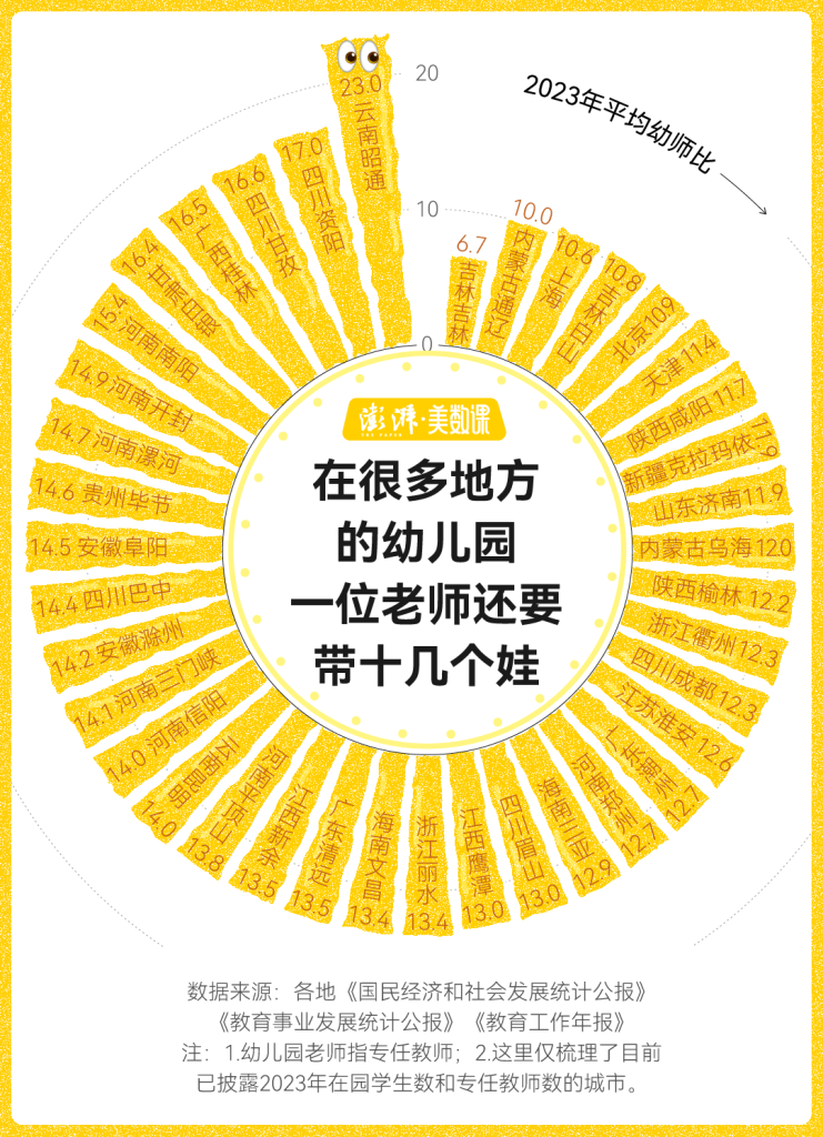 更何况,在我们梳理的多地 2023 年幼儿园情况中,有不少城市的幼儿园师生比是低于 1:14 的。