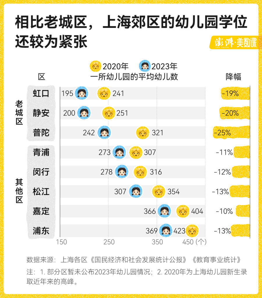2023 年 7 月,上海市嘉定区教育局公布了一份名为《嘉定区关于全面建设高质量幼儿园的实施方案》,提到在嘉定区内“个别地区的公办幼儿园资源仍显不足,导致部分公民办幼儿园存在大班额和生均面积不达标等问题,部分幼儿园的园舍条件尚未符合国家规定标准。”
