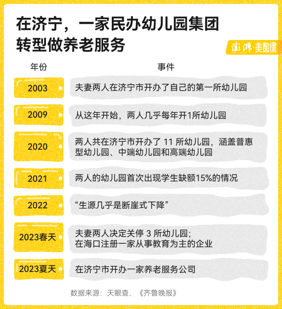 在山东济宁,于波、崔瑾夫妻俩在从业 21 年间连续开了 11 所幼儿园。但由于在园孩子减少三分之一,2023 年春天,他们决定关停 3 所幼儿园,并转型做养老服务。
