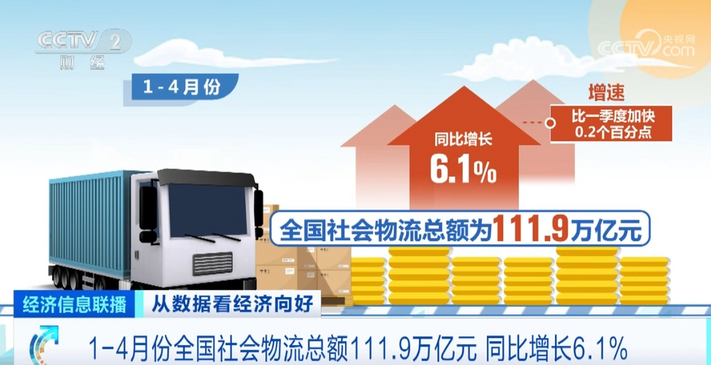 1—4月份,全国社会物流总额为111.9万亿元,同比增长6.1%,增速比一季度加快0.2个百分点。4月份同比增长6.6%,比3月份提高2.2个百分点。