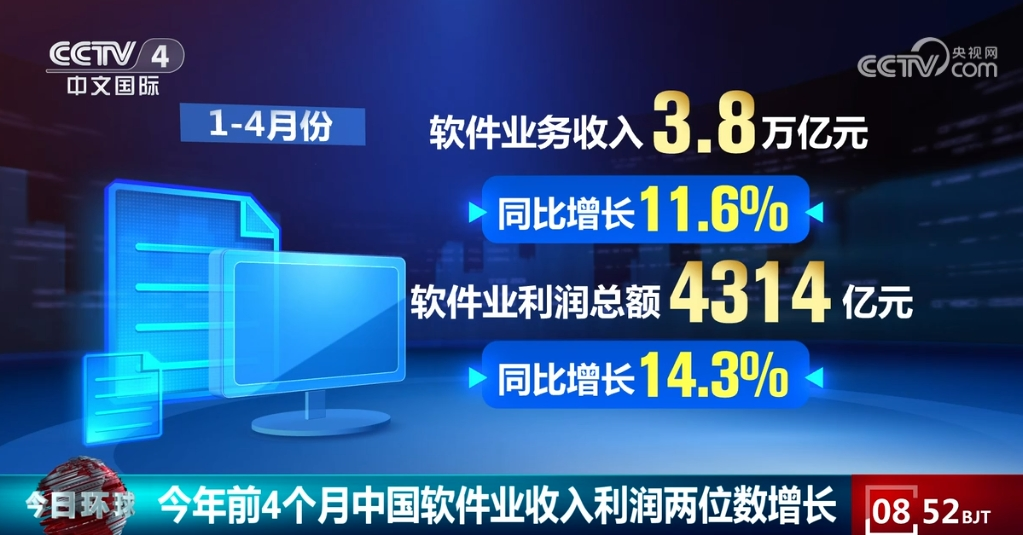工业和信息化部数据显示,今年前4个月,中国软件业运行平稳,收入利润实现两位数增长。1—4月份,软件业务收入3.8万亿元,同比增长11.6%。软件业利润总额4314亿元,同比增长14.3%。其中,云计算、大数据服务共实现收入4107亿元,同比增长14.3%。