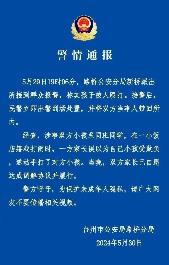 5月30日,据浙江台州市公安局路桥分局通报:5月29日19时06分,路桥公安分局新桥派出所接到群众报警,称其孩子被人殴打。接警后,民警立即出警到场处置,并将双方当事人带回所内。经查,涉事双方小孩系同班同学,在一小饭店嬉戏打闹时,一方家长误以为自己小孩受欺负,遂动手打了对方小孩。当晚,双方家长已自愿达成调解协议并履行。警方呼吁,为保护未成年人隐私,请广大网友不要传播相关视频。