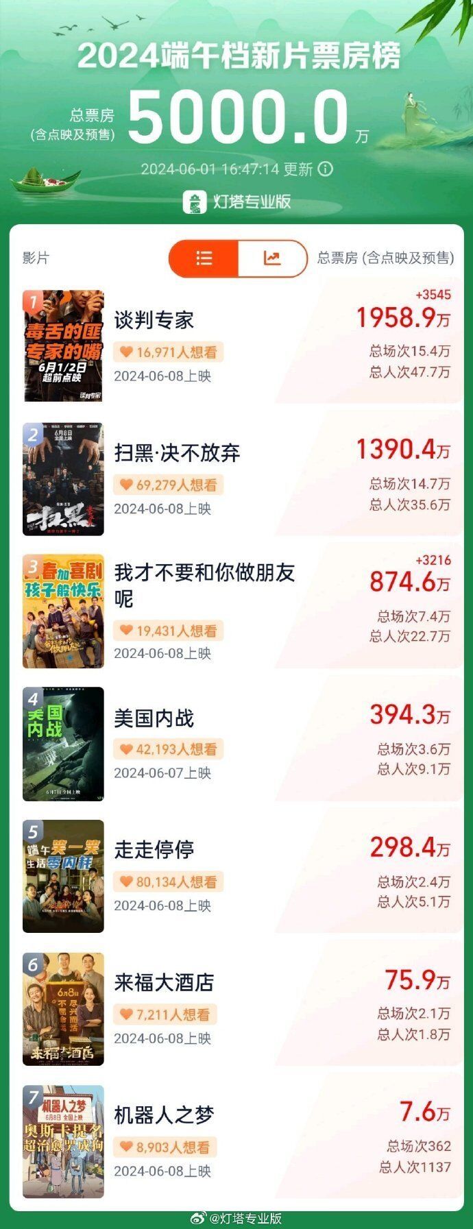 据灯塔专业版,截至6月1日16时47分,2024年端午档新片预售(含点映)总票房突破5000万!