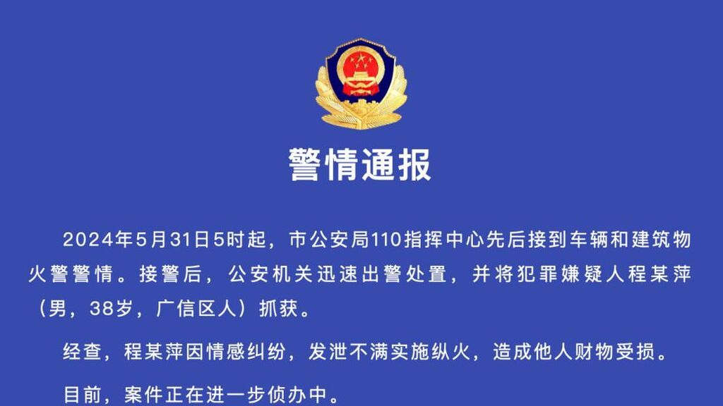·江西上饶一男子因情感纠纷纵火:引发车辆和建筑物火警,已被抓获。