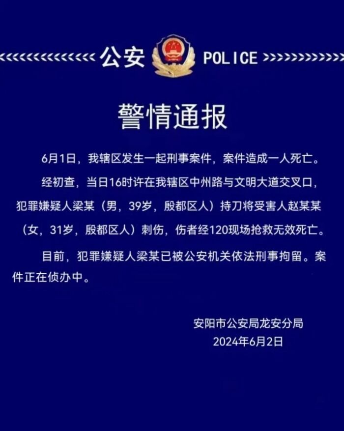 央视网消息:河南安阳市公安局龙安分局6月2日发布警情通报:6月1日,辖区发生一起刑事案件,案件造成一人死亡。经初查,当日16时许在辖区中州路与文明大道交叉口,犯罪嫌疑人梁某 (男,39岁,殷都区人)持刀将受害人赵某某(女,31岁,殷都区人)刺伤,伤者经120现场抢救无效死亡。目前,犯罪嫌疑人梁某已被公安机关依法刑事拘留。案件正在侦办中。