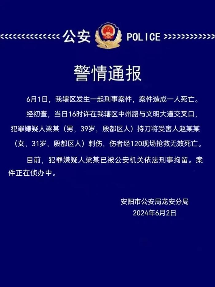 ·河南安阳警方:一男子持刀将女子刺伤致死被刑拘。