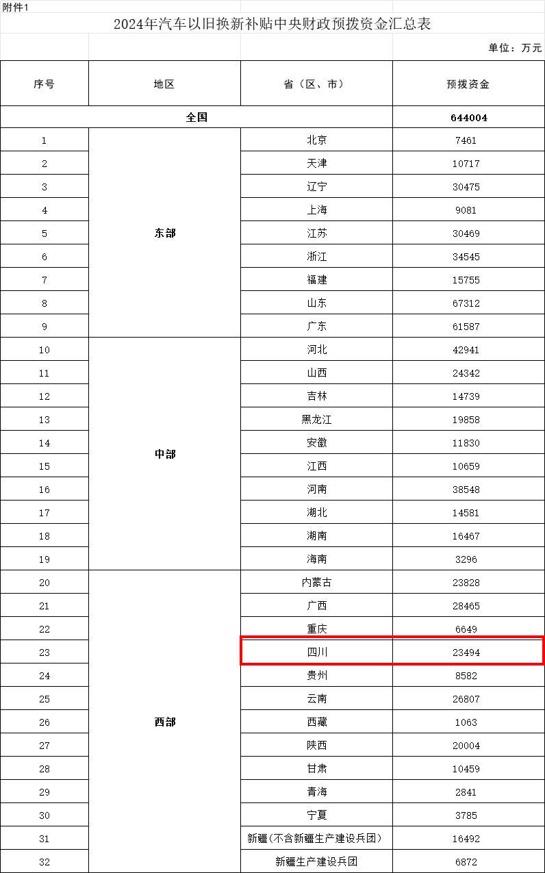 财政部关于下达2024年汽车以旧换新补贴中央财政预拨资金预算的通知